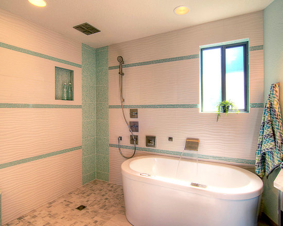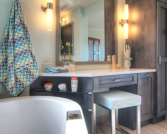 Angled walls made space-planning and reframing a challenging puzzle to solve and we not only had to measure the interior, but the exterior angles as well since we were removing walls. Luckily, the large “wet room” concept met the client’s needs and overcame this obstacle. The new space features a stand-alone tub open showering area, as well as sink vanity, and seated makeup area. Additionally, storage needs were addressed with a wall of cabinetry installed adjacent to the new walk-in closet. A serene color palette and a variety of textures gives this bathroom a spa-like vibe and the aqua highlights repeated in glass accent tiles.