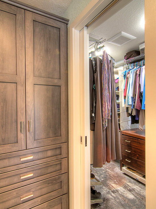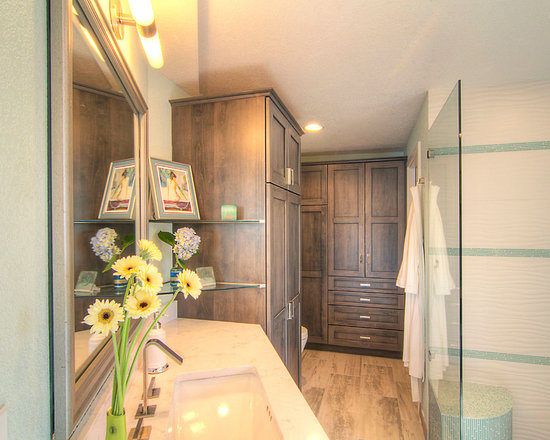 • An angled countertop and glass shelving add interest between the sink vanity and closet cabinetry.