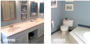 - Bathtub replaced with a large shower and two separate vanity areas. The woman of the house has a larger vanity housing an off-center sink/mirror/light location. A tall adjacent storage cabinet houses a hamper. The husband has a pedestal sink with integrated counter space and a 24″-wide recessed cabinet.